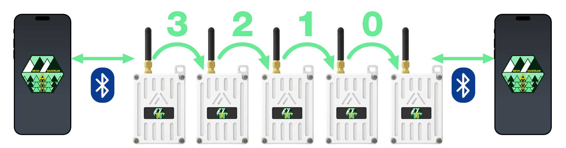 Die Weiterleitung einer Nachricht von einer Node zur anderen wird im Meshtastic® Netzwerk als Hop bezeichnet.